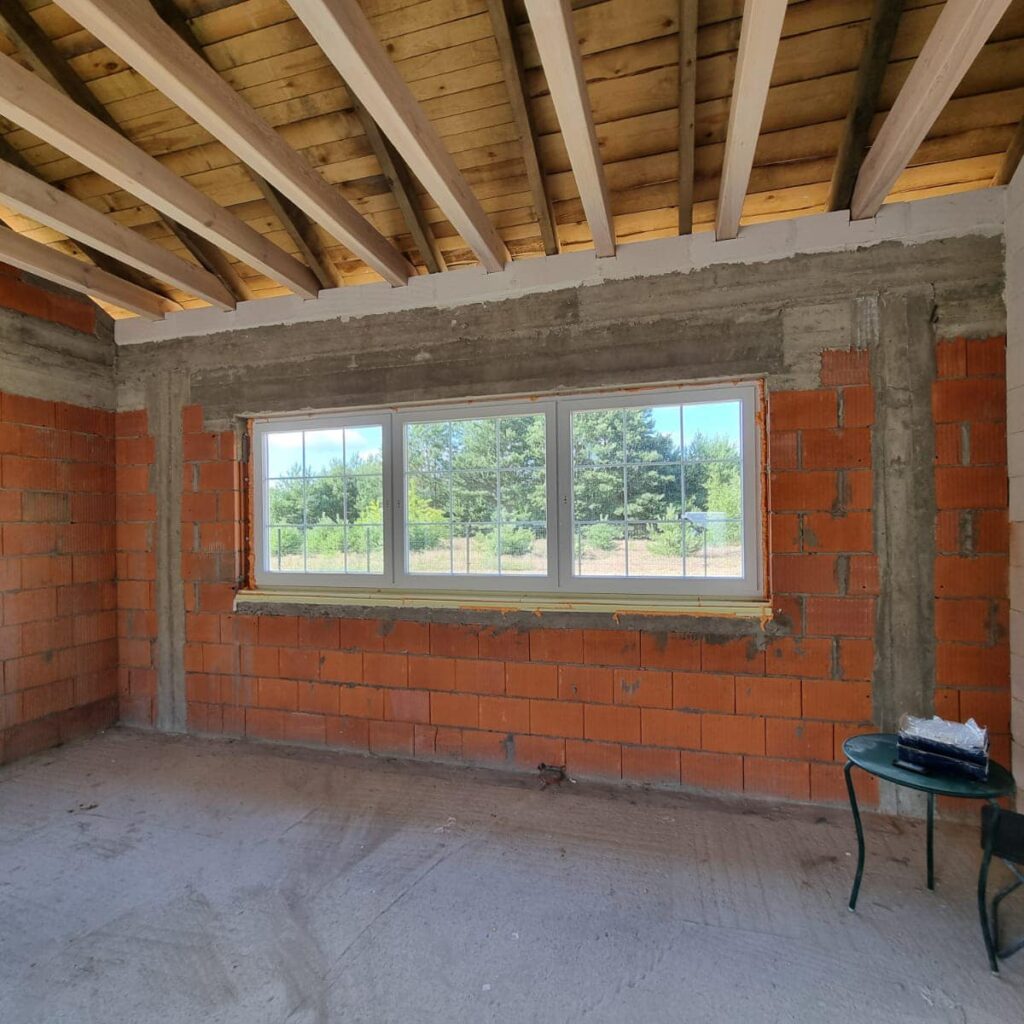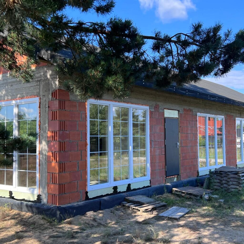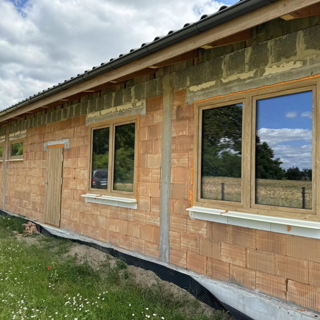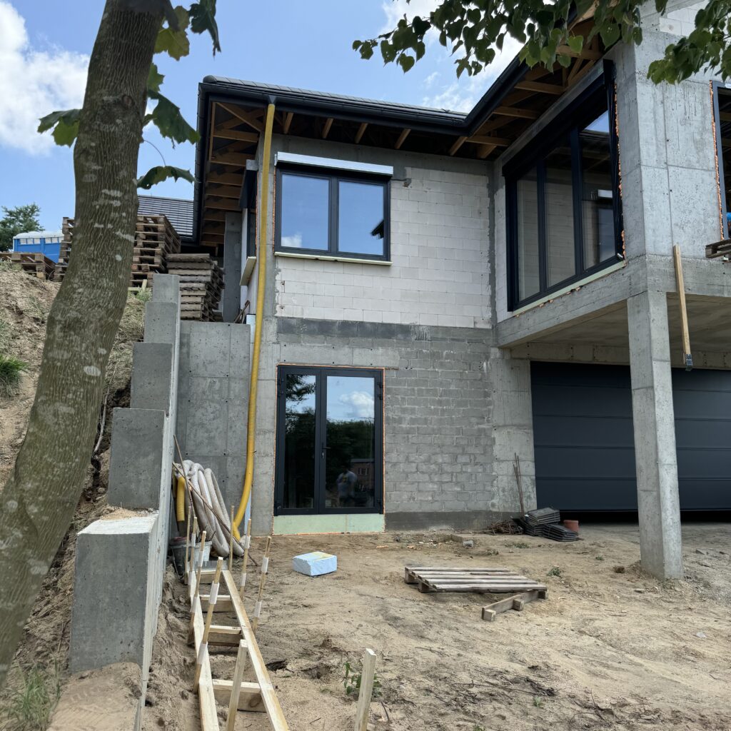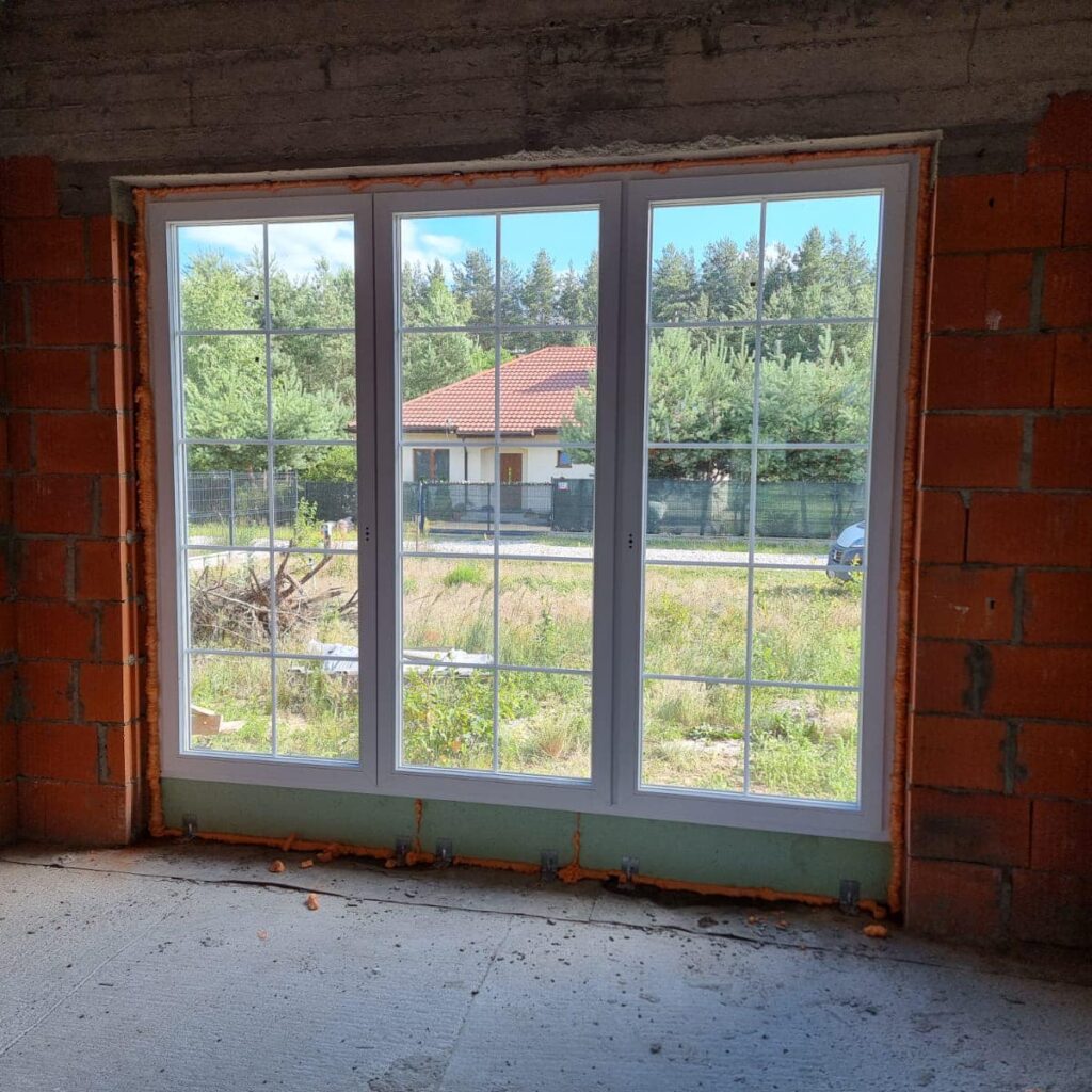 Na życzenie klienta profil Salamander BluEvolution 92 w kolorze białym z szprosami. Drzwi zastępcze na czas budowy.