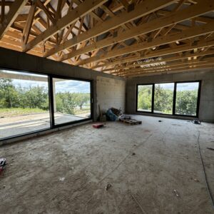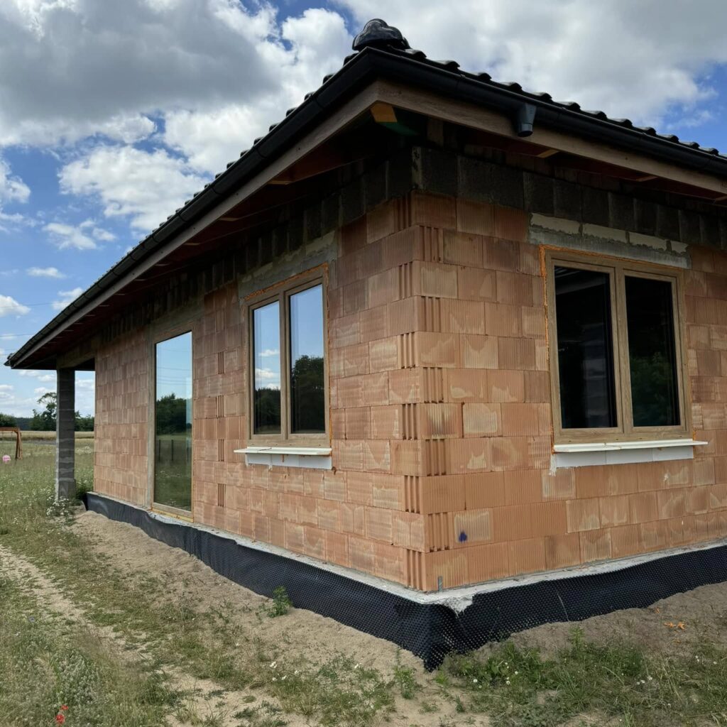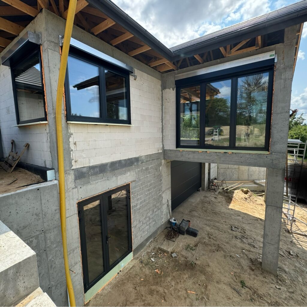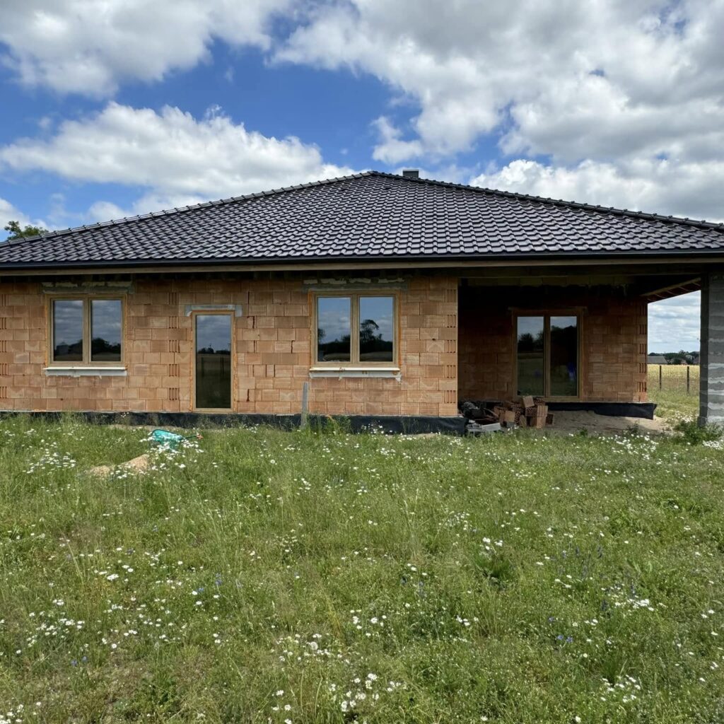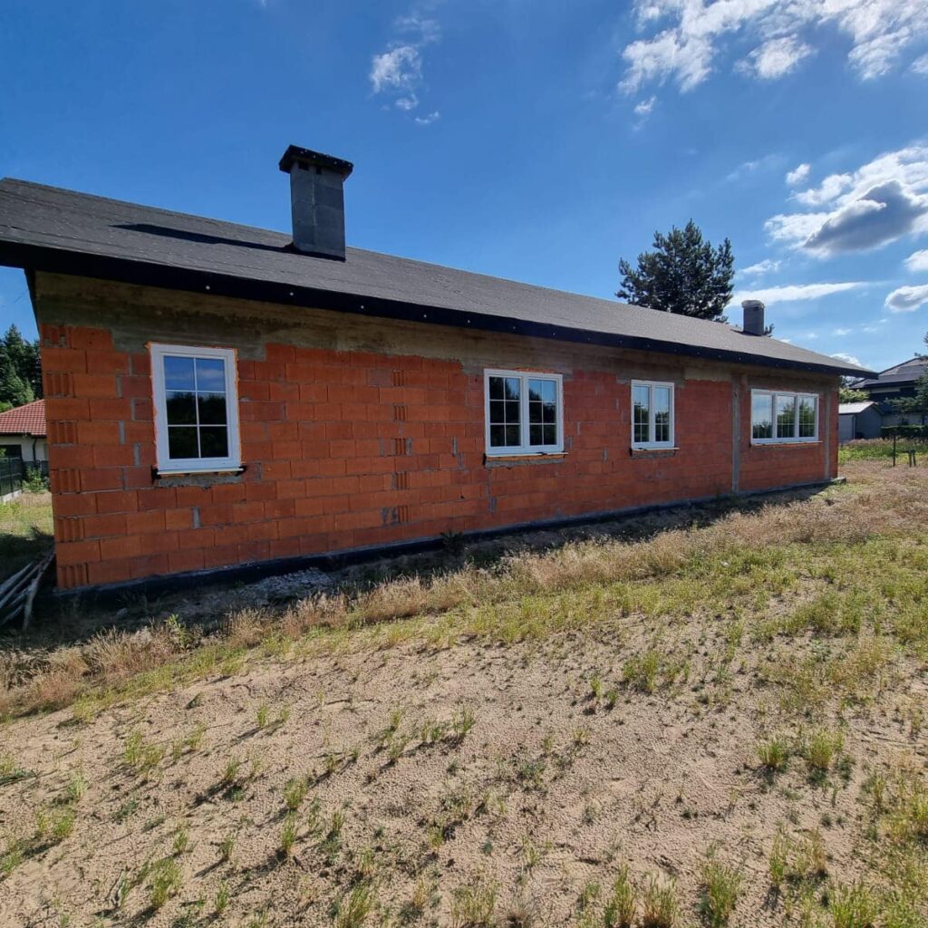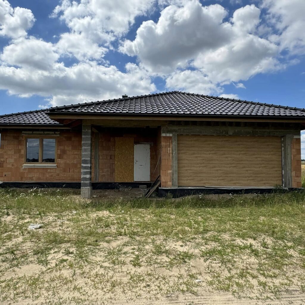 Na życzenie klienta profil Salamander BluEvolution 92 w kolorze białym z szprosami. Drzwi zastępcze na czas budowy.